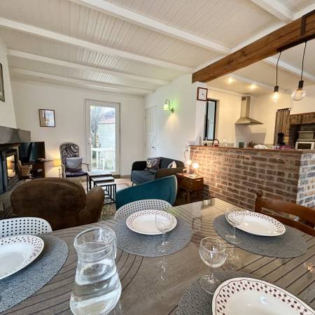 Descriptif: Dans un quartier calme, non loin de la plage et du centre ville, maison aménagée dans une ancienne auberge, comprenant une entrée sur cuisine équipée (plaque induction/micro-ondes/lave-vaisselle/combiné réfrigérateur-congélateur/minifour...), un double séjour avec espace repas (table/chaises/bancs) et un salon avec cheminée feu de bois (canapé/téléviseur/box), un sas de dégagement (lave-linge) une salle de douche avec WC.