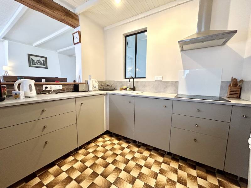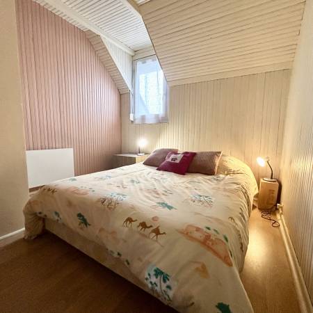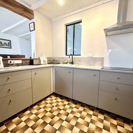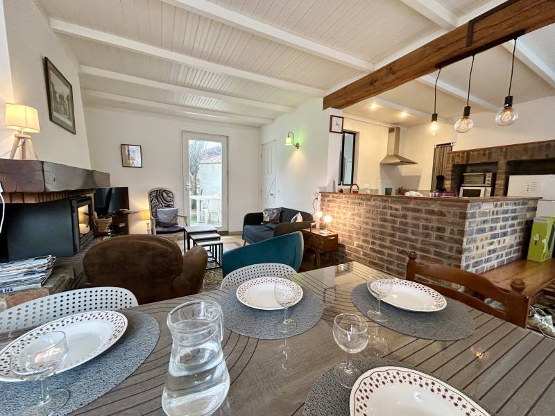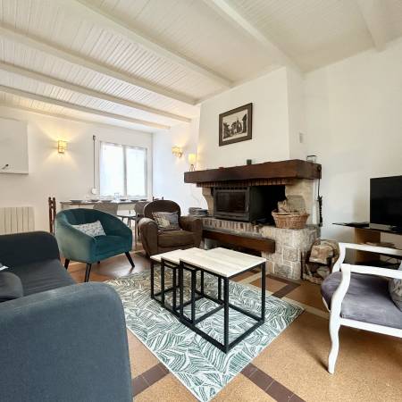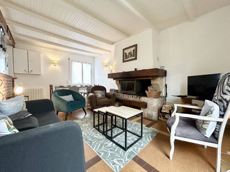 Descriptif: Dans un quartier calme, non loin de la plage et du centre ville, maison aménagée dans une ancienne auberge, comprenant une entrée sur cuisine équipée (plaque induction/micro-ondes/lave-vaisselle/combiné réfrigérateur-congélateur/minifour...), un double séjour avec espace repas (table/chaises/bancs) et un salon avec cheminée feu de bois (canapé/téléviseur/box), un sas de dégagement (lave-linge) une salle de douche avec WC.