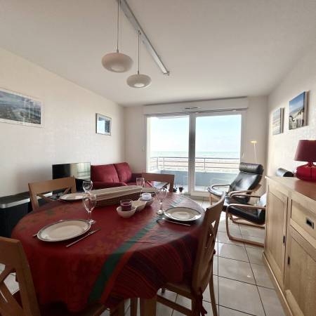 Descriptif: Face à la mer, bel appartement aménagé avec charme, situé au premier étage d'une résidence récente avec ascenseur et comprenant une entrée, une cuisine équipée ouverte sur le séjour (lave-vaisselle/ Lave-linge/micro-ondes/four multifonctions/plaque vitrocéramique/réfrigérateur/cafetière senséo/bouilloire/grille-pain), une pièce de séjour avec espace repas et salon (téléviseur/lecteur dvd) donnant sur un balcon (salon de jardin/transat) avec belle vue sur la plage.