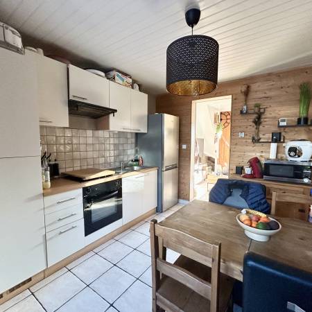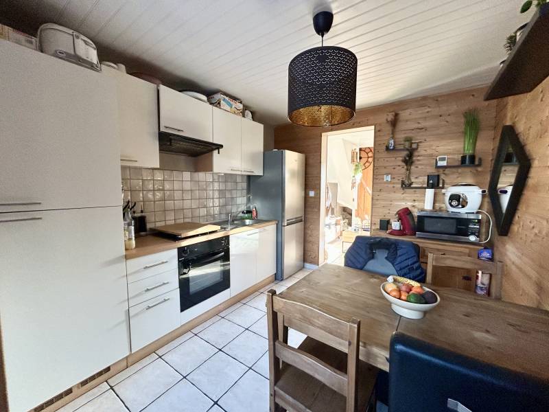 Cette agréable maison se compose d'un salon donnant directement sur une terrasse, parfait pour profiter des beaux jours. La cuisine aménagée et équipée, accompagnée de son coin repas, offre un espace convivial et fonctionnel.